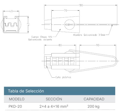 En las ranuras centrales de las cuñas plásticas se pueden retener hasta 2 conductores concéntricos de 4 ó 6mm2. Su diseño permite el desplazamiento vertical y horizontal de 15 grados sin fatigar las aislaciones de los conductores.